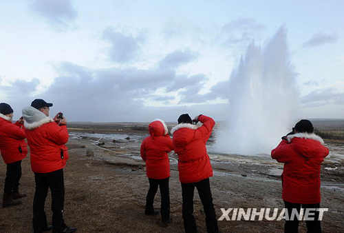 11月19日,游客在冰岛首都雷克雅未克北部著名的间歇泉拍照。新华社记者 郭磊 摄