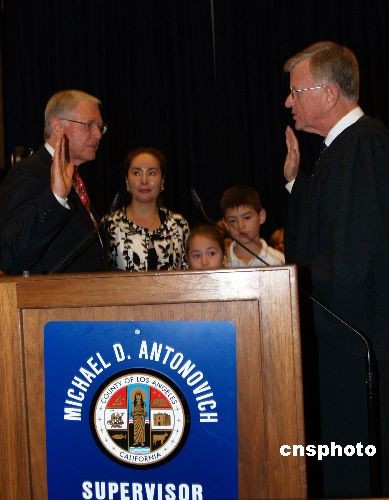 当地时间12月1日,美国华人女婿安东若维奇〔左〕竞选连任洛杉矶县政委员获得连任成功,他在大法官监誓下宣誓就职,他的太太、来自中国辽宁的胡惠玲及一双儿女在一旁观礼。 中新社发 卢威 摄
