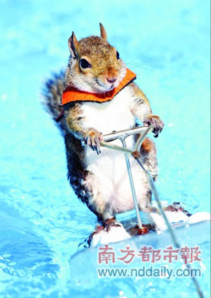 松鼠也爱冲浪。在美国佛罗里达州,8岁的“翠吉”在主人卢·安·贝斯特的调教下成为了世界上惟一会冲浪的松鼠。贝斯特说,“翠吉”最开始有些怕水,经过训练,它已成为“冲浪高手”。