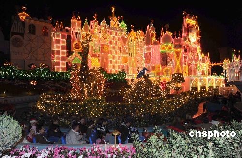 十二月二十三日晚,加州迪斯尼乐园以盛大的灯饰秀吸引众多游客。美国经济持续不景气,各类主题公园的生意蒙上阴影。为了抵御经济衰退带来的民众消费力下降,加州迪斯尼乐园在圣诞假期推出一系列新颖节目和促销活动,招揽更多游客。中新社发 张炜 摄