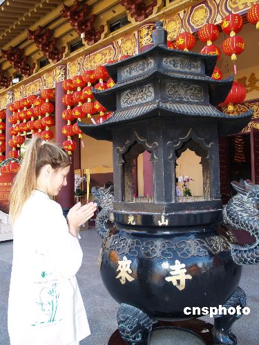 2009年1月20日,中国新年将至,前往美国洛杉矶西来寺礼佛上香的信众越来越多,其中也有碧眼金发的美女前来拜佛。中新社发 卢威 摄
