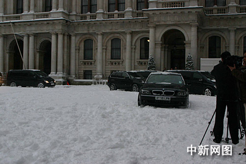 当地时间二月二日上午八时三十分许,中国总理温家宝在英国伦敦出席布朗首相举行的欢迎仪式。图为温家宝的座车驶入英国外交部内庭院欢迎仪式现场。前夜,伦敦突然迎来近十七年最大的一场降雪,整座城市被白雪覆盖。中新社记者 张朔 摄