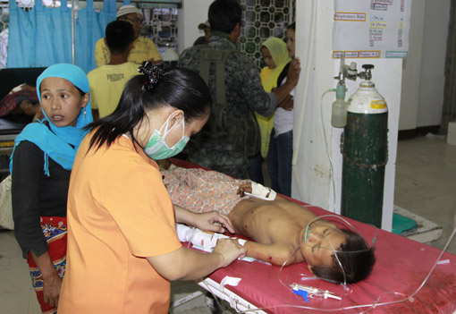3月3日,在菲律宾南部哥打巴托附近的小镇布尔顿,一枚来历不明的迫击炮弹被一群儿童挖出后发生爆炸,造成3名儿童死亡,5人受伤。图为一名被炸伤的儿童接受治疗。