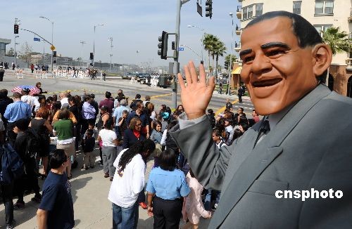 当地时间三月十九日下午,美国总统奥巴马在洛杉矶市中心附近参加市民集会,他向美国民众喊话:尽管美国的经济复苏之路面临诸多挑战,但前景是光明的。中新社发 张炜 摄