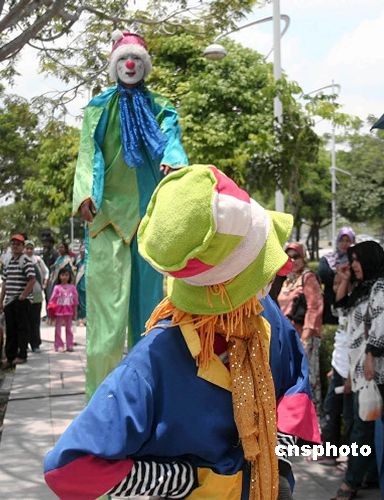 3月21日,马来西亚首都吉隆坡新行政中心布城举行热气球嘉年华活动,踩着高跷的小丑进行表演吸引当地民众。中新社发 赵胜玉 摄