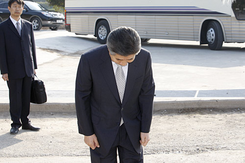 4月30日,韩国前总统卢武铉从位于首都首尔东南约450公里的家中离开,准备接受检察机关的质询时向媒体记者鞠躬。