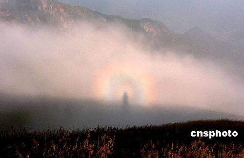 8月13日清晨,江西武功山最高峰金顶景区出现“云海佛光”。当日上午,武功山四绝(高山草甸、奇松怪峰、云海佛光、飞瀑流泉)之一的“云海佛光”在雨雾过后连续出现多次,持续半小时,令游客惊叹不已。 中新社发 朱文标 摄