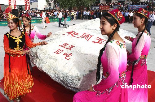 九月六日,第三届且末和田玉展销会在三面画沙的新疆且末县举行,来自新疆及扬州、福州等地的各路玉石商人云集该县,采购上等昆仑美玉。位于新疆昆仑山上的且末玉矿和田玉山料产量占新疆和田玉产量的白分之七十以上,是和田玉最大的原料供应基地,产品远销日本、韩国、新加坡等地,年利润近千万元人民币。中新社发 刘新 摄