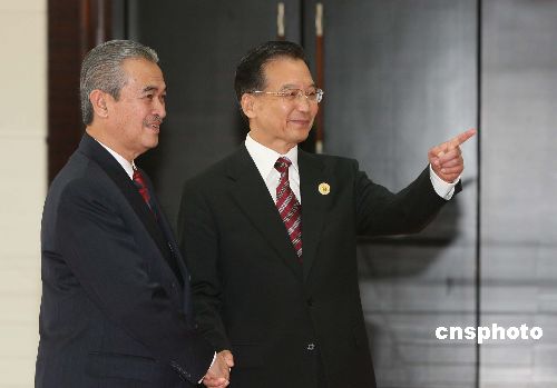 十月三十日,中国—东盟建立对话关系十五周年纪念峰会在广西南宁荔园山庄国际会议中心开幕。图为中国国务院总理温家宝欢迎马来西亚总理巴达维。中新社发 廖文静 摄