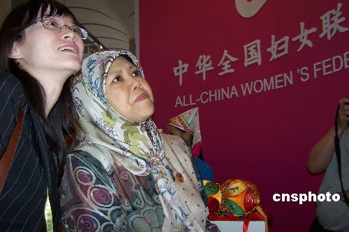 十月三十一日,文莱公主玛斯娜在广西南宁国际会展中心观看全国妇联展出的图片。第三届中国—东盟博览会当天在南宁开幕。中新社发 王刚 摄