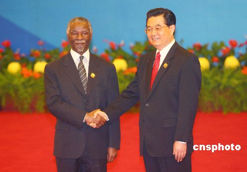 11月4日,中非合作论坛北京峰会在北京人民大会堂开幕。中国国家主席胡锦涛在大会开幕前迎接南非总统姆贝基。中新社发 盛佳鹏 摄