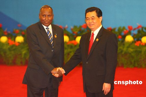 11月4日,中非合作论坛北京峰会在北京人民大会堂开幕。中国国家主席胡锦涛在大会开幕前迎接索马里过渡联邦政府总统艾哈迈德。中新社发 盛佳鹏 摄