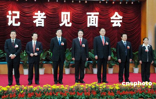 1月29日,海南省四届人大一次会议选举产生新一届海南省人民政府省长、副省长。图为海南省长罗保铭(中),副省长方晓宇(右三)、姜斯宪(左三)、林方略(右二)、陈成(左二)、符跃兰(右一)、李国梁(左一)集体亮相记者见面会。中新社发 尹海明 摄