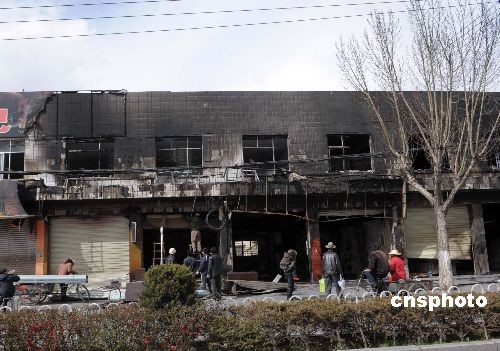 3月20日,工作人员在清理拉萨市林廓北路上被焚毁的商铺。据了解,拉萨市有840多家商户在打砸抢烧事件中受损,直接经济损失超过2亿元。中新社发 廖攀 摄