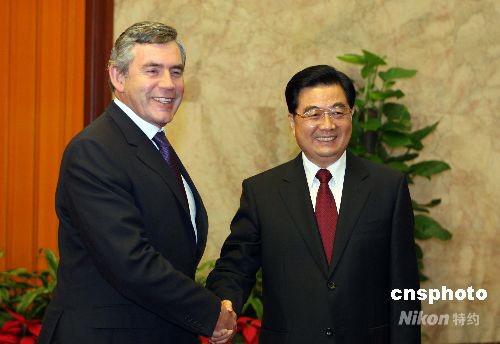 8月22日,中国国家主席胡锦涛在北京人民大会堂会见英国首相布朗。中新社发 廖文静 摄