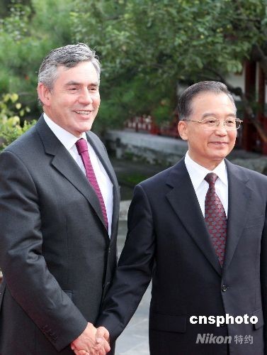8月22日,中国国务院总理温家宝在北京钓鱼台国宾馆会见英国首相布朗。中新社发 廖文静 摄