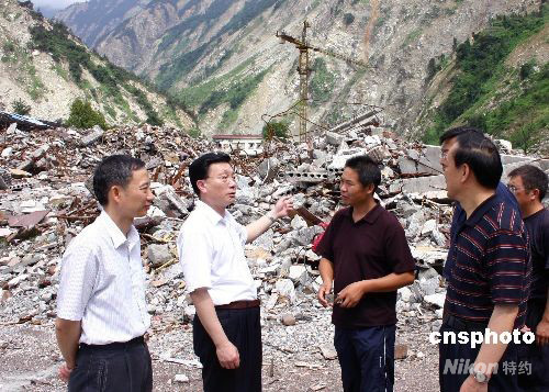 8月25日,中国国务院侨务办公室副主任马儒沛、国内司司长程铁生一行赴四川灾区进行为期三天的考察,重点考察“侨爱学校”的选址和进展情况。图为马儒沛(左二)在震中映秀映电宾馆废墟前了解灾情。中新社发 黄永莉 摄