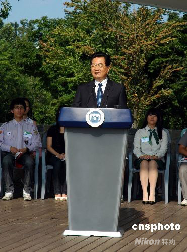 中国国家主席胡锦涛8月26日在首尔林公园同韩国总统李明博共同会见中韩青年代表时,寄语中韩青年代表当日种下的中韩友谊之树一定会茁壮成长。中新社发 孙宇挺 摄