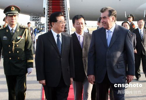应塔吉克斯坦总统拉赫蒙的邀请,中国国家主席胡锦涛8月26日抵达塔吉克斯坦首都杜尚别,开始对塔吉克斯坦进行首次国事访问,并出席即将在杜尚别举行的上海合作组织成员国元首理事会第八次会议。塔吉克斯坦总统拉赫蒙亲自到机场迎接。中新社发 齐彬 摄