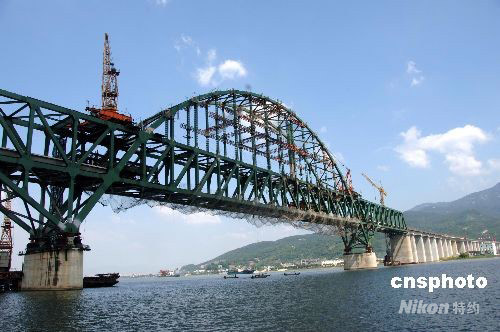 9月12日上午10时,随着最后一根钢梁被高强度螺栓定位夯实,中铁大桥局承建的福州至厦门高速铁路控制性工程——闽江特大桥实现精确合龙。该大桥全长2690.64米,钢梁总量8600多吨。在施工中建设并创造了国内铁路客运专线最大跨度、桥梁支座承载力、树叉异型连续梁结构、采用三斜腹板预应力混凝土槽形梁等四项建桥技术第一。 中新社发 郑祚声 摄