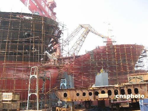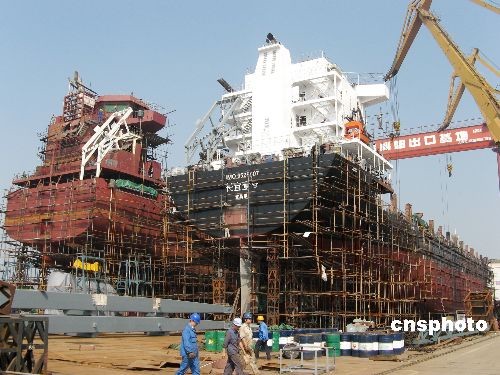 10月15日,位于川江的湖北宜昌长航船厂,首艘12000吨级出口海轮和宜昌港籍第一艘9000吨级货轮并肩制造,已见雏形,本月择日下水出口或交货。该船台正在创造宜昌三峡制造最大吨位海轮和拥有最大吨位船舶的两个纪录。据了解,在宜昌,仅长航船厂本月内就将下水4艘万吨级轮船。中新社发 韩玉洪 摄