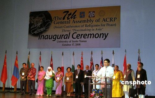 亚洲宗教和平会议第七届大会十月十七日在菲律宾首都马尼拉开幕。中国宗教界和平委员会派出的二十八人代表团出席大会,成员涵盖中国的佛教、道教、伊斯兰教、天主教和基督教五大宗教。大会开幕式上,参加亚洲宗教和平会议的各国宗教团体代表走上主席台,右一为中国代表团副团长、中国道教协会会长任法融。中新社发 徐长安 摄