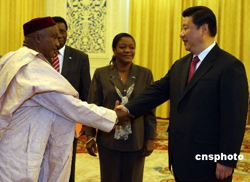11月6日下午,中国国家副主席习近平在北京人民大会堂会见塞拉利昂外交部部长扎伊娜卜·哈瓦·班古拉(中)一行。中新社发 任晨鸣 摄