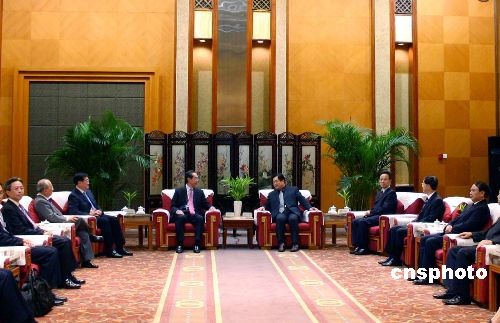 11月7日,四川省省长蒋巨峰在成都会见了前来出席“香港特区政府援建‘川港康复中心’及香港赛马会援建项目签字仪式”的香港特区政府政务司司长唐英年一行。唐英年表示,香港支援四川灾后重建决心不会受金融危机影响。中新社发 黄永莉 摄