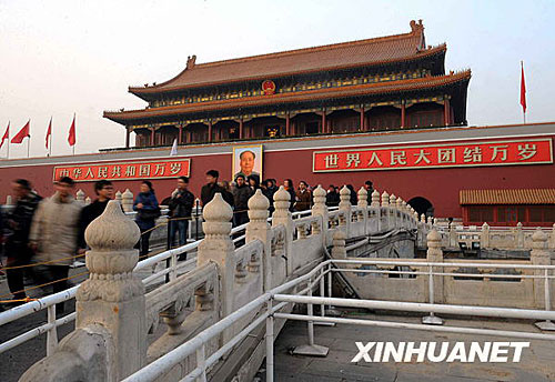 据北京市文物局9日透露,为迎接2009年国庆60周年,确保游客和文物安全,北京市文物局已于近日启动了天安门金水桥加固修缮工程,整个工程预计将于2009年5月完工。天安门金水桥是整个天安门景观的重要组成部分,因游客众多以及风化等自然因素,天安门金水桥桥面此前多处出现破损,栏杆部分也出现裂缝,存在一定的安全隐患。新华社记者罗晓光摄