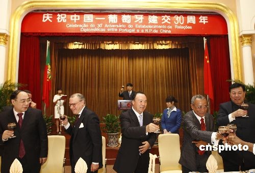 2月12日,由中国人民对外友好协会、葡萄牙驻华使馆联合举办的中葡建交三十周年庆祝招待会在北京举行,全国政协副主席白立忱、全国友协会长陈昊苏、外交部部长助理吴红波、葡萄牙驻华大使桑托斯以及百余名中外来宾出席。中新社发 盛佳鹏 摄