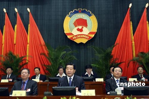 3月11日,全国政协第十一届全国委员会常务委员会第五次会议在北京举行,会议通过政协第十一届全国委员会第二次会议关于常务委员会工作报告的决议(草案),审议通过政协第十一届全国委员会提案委员会关于政协十一届二次会议提案审查情况的报告(草案),通过政协第十一届全国委员会第二次会议政治决议(草案)。全国政协主席贾庆林主持会议。 中新社发 盛佳鹏 摄