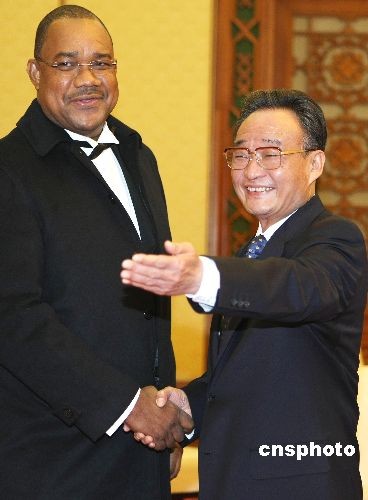 3月23日下午,中国全国人大常委会委员长吴邦国在北京人民大会堂会见来访的塞舌尔国民议会议长帕特里克·赫米尼耶一行。中新社发 任晨鸣 摄