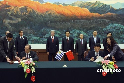 3月23日,中国国家主席胡锦涛在北京人民大会堂与乌拉圭总统巴斯克斯举行会谈,并于会谈后共同出席两国涉及经贸、体育等领域多项合作文件的签字仪式。中新社发 盛佳鹏 摄