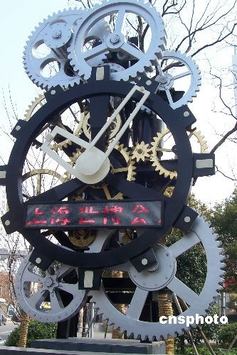 3月25日,一座高5米、宽2.5米,由一组直径0.8至2.4米、环环相扣的齿轮组成的“迎世博倒计时钟”亮相在上海威海路和延安中路路口街头,2010年上海世博会开幕时间越来越近。中新社发 周东潮 摄