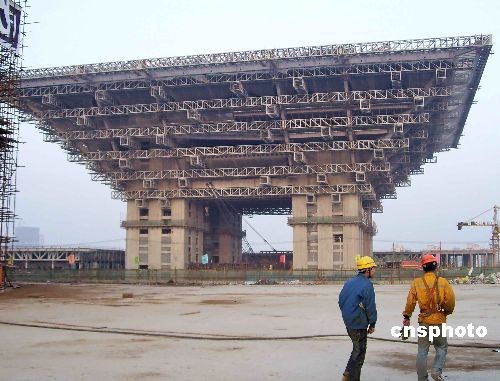 2009年3月25日消息,上海世博会场馆建设正在有条不紊地进行。上海世博会执委会副主任周汉民透露,中国馆目前已经封顶,今年年底建设将全部完成。中国馆是上海世博会的标志性建筑,将永久地保存。中新社发 井韦 摄