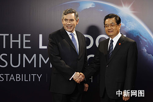当地时间2日上午,中国国家主席胡锦涛抵达位于东伦敦的国际会展中心,出席在这里举行的二十国集团领导人第二次金融峰会。图为峰会东道主英国首相布朗在会场欢迎胡锦涛。理查德 摄