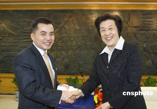4月15日下午,香港律政司司长黄仁龙先生在北京拜访司法部部长吴爱英(右)。中新社发 郑雄增 摄