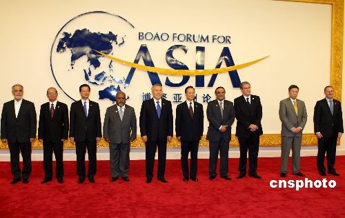 4月18日上午,在“博鳌亚洲论坛2009年会”开幕大会前,中国国务院总理温家宝(右五)与出席会议的九位各国首脑合影。中新社发 任晨鸣 摄