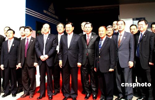 四月二十七日下午,海基会董事长江丙坤一行在海协会副会长郑立中、李炳才陪同下,抵达扬州参访位于扬州经济开发区的台资企业宝宏制鞋公司参观。中新社发 崔佳明 摄
