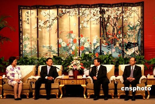 四月二十七日晚,中共扬州市委书记季建业在迎宾馆会见海基会董事长江丙坤一行。中新社发 崔佳明 摄