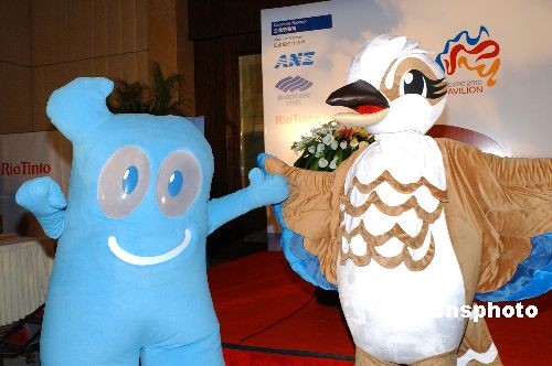 5月8日,2010年上海世博会澳大利亚馆的吉祥物在上海揭晓,图为澳大利亚馆的吉祥物笑翠鸟(右)与上海世博会吉祥物海宝登台亮相。据介绍,笑翠鸟体现了澳大利亚人聪明自信、足智多谋、诙谐幽默的个性。中新社发 张亨伟 摄
