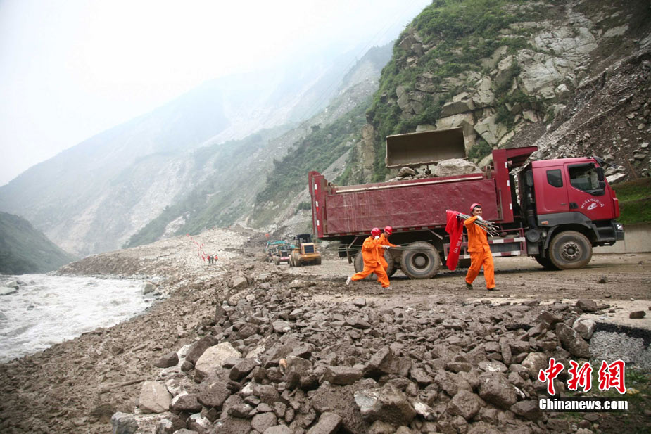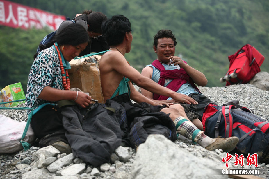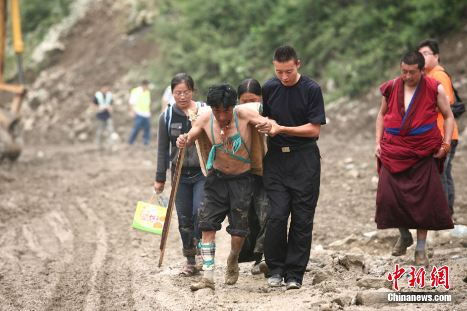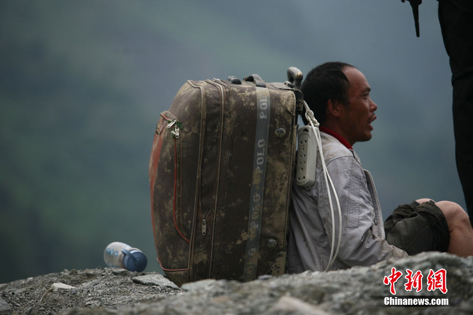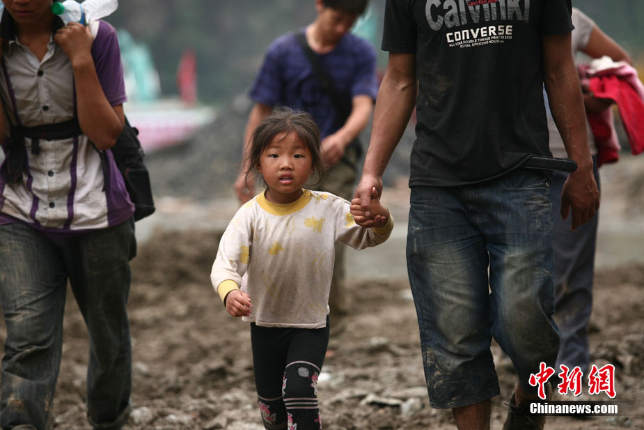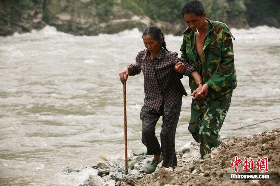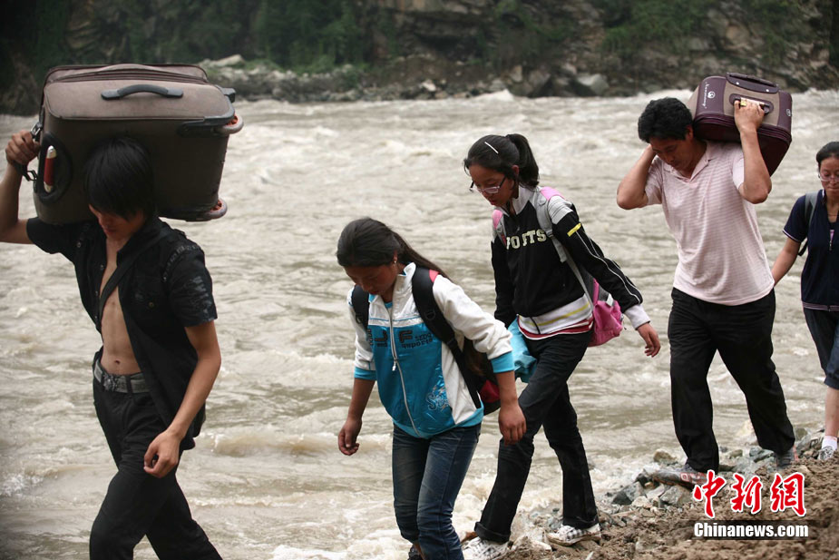 8月16日,滞留在汶川泥石流灾区的群众纷纷徒步翻山越岭撤离自己家园,赶往都江堰、成都等安全地带。8月14日凌晨汶川境内多处发生泥石流灾害,导致汶川境内多条公路中断、民房冲毁,地震灾区群众新家园受到新的创伤,通过武警官兵对道路三天三夜的抢险,从汶川到映秀镇路段危险基本排除。 中新社发 张浪 摄