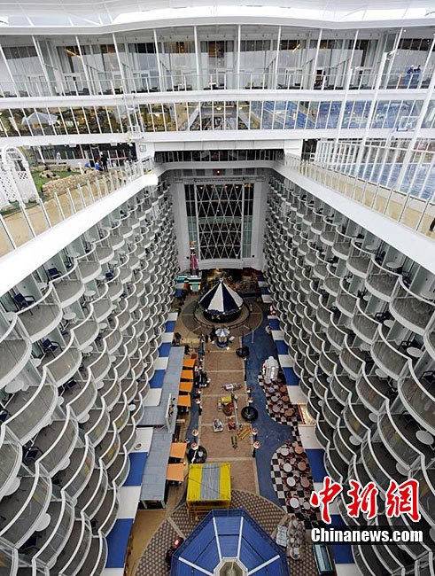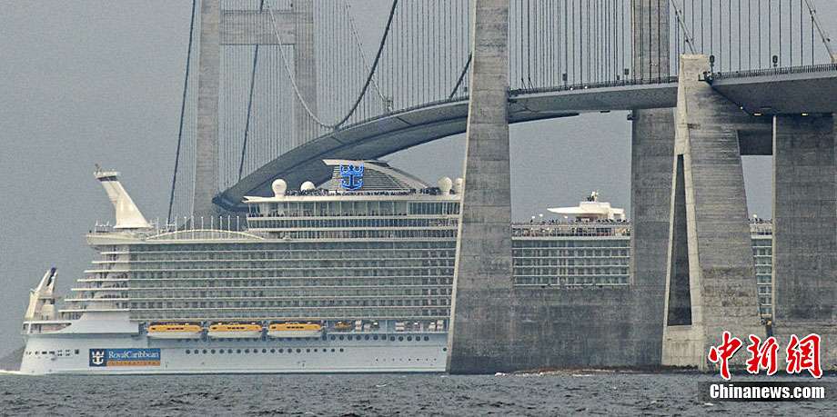 近日,世界最大邮轮“海洋魅力号”于芬兰图尔库船厂完工,并将于2010年12月进行首航。这艘堪称海上奇观的豪华邮轮长361米、宽66米,水面高72米,排水量达22.5万吨,共有16层甲板和2704个客舱,可搭载6360名游客和2100名船员。尚未经受大风大浪考验的海洋魅力号在从造船厂前往美国佛罗里达州的过程中顺利通过了丹麦一座距离船顶4厘米的大桥。