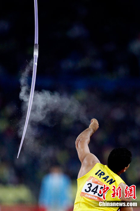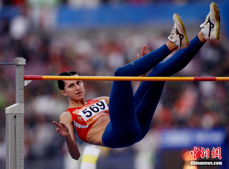 11月26日,广州亚运会女子跳高,吉尔吉斯斯坦选手塔季扬娜·叶菲缅科在越过横杆的瞬间还不忘看看标尺刻度,显得非常冷静。中新社记者 杜洋 摄