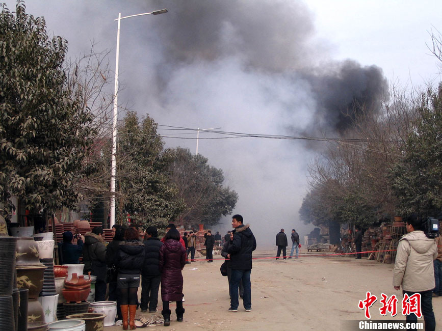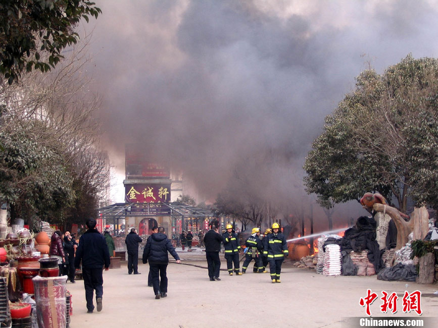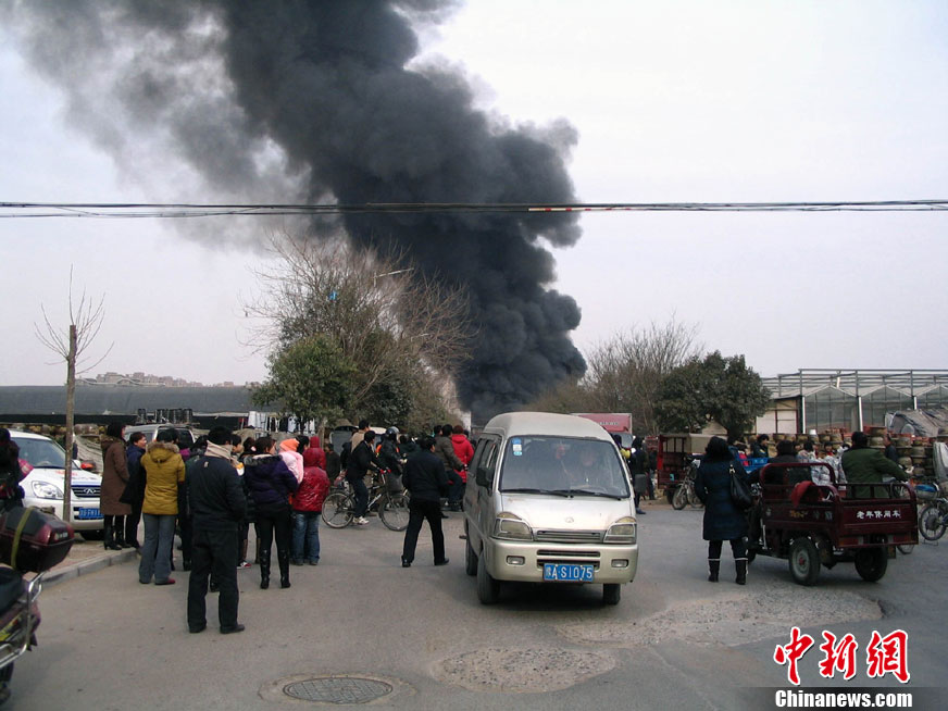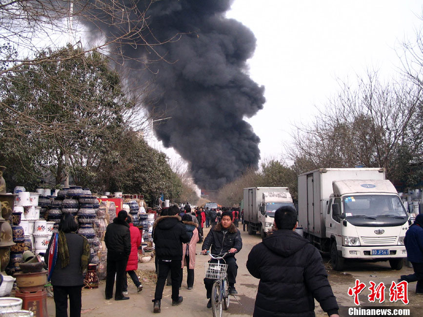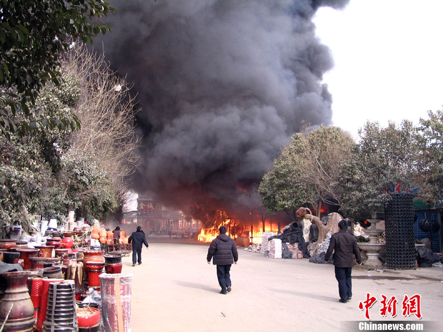1月9日11时左右,位于郑州北环的陈砦花卉市场一家经营塑料花盆批发业务的商户突然起火,火势蔓延迅速,在空中形成一条数百米的黑色巨龙。中午12时30分,明火被扑灭,火势基本得到控制。大火没有造成人员伤亡。汤荔 摄