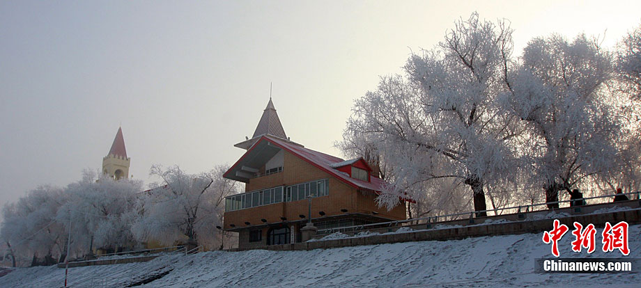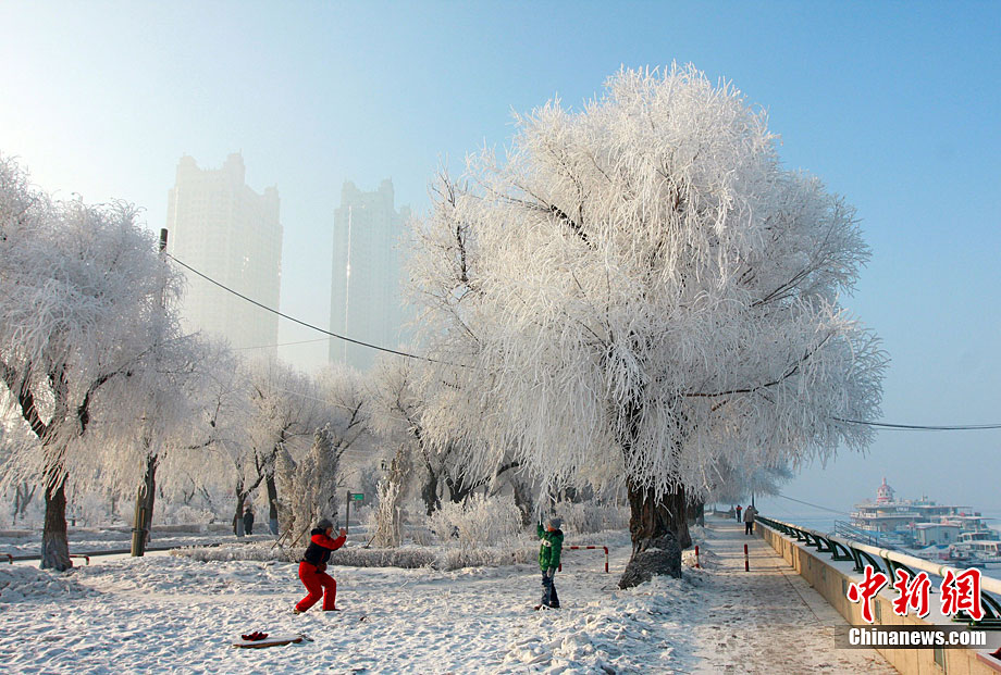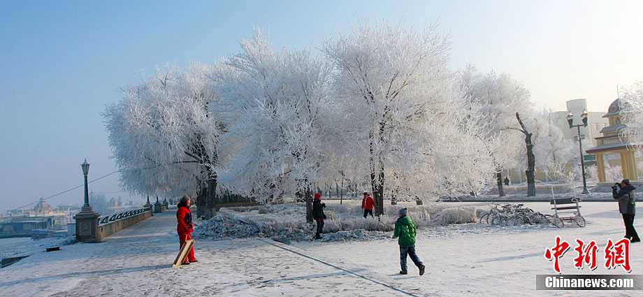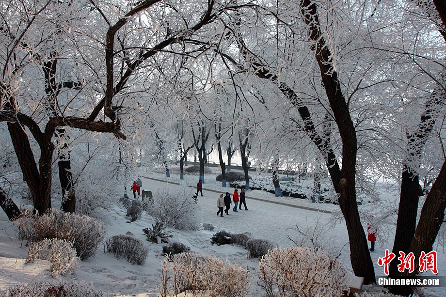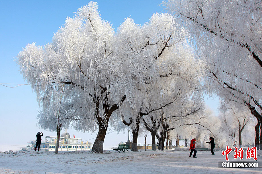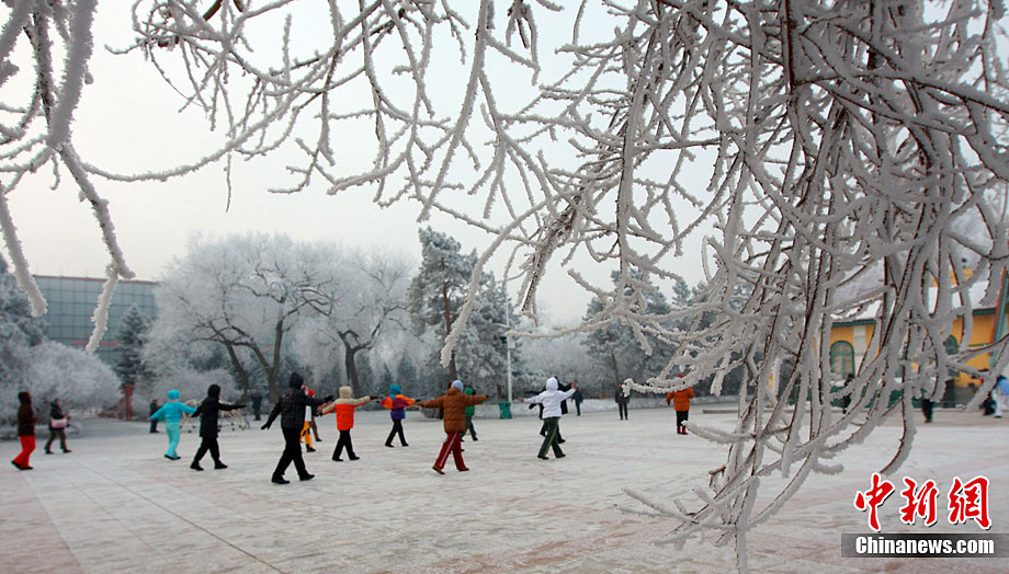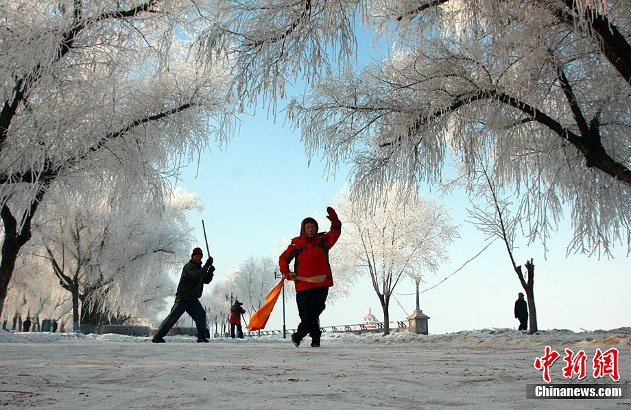 2月17日,哈尔滨大雾缭绕,惊现雾凇景观。当日正是农历正月十五元宵节,给冰城带来一份难得的美景,晨练的市民纷纷拍照留念。姚庭山 摄 图片来源:CNSPHOTO
