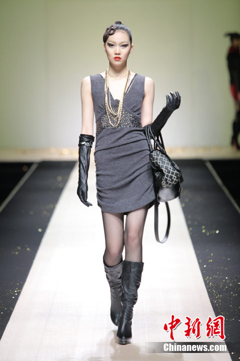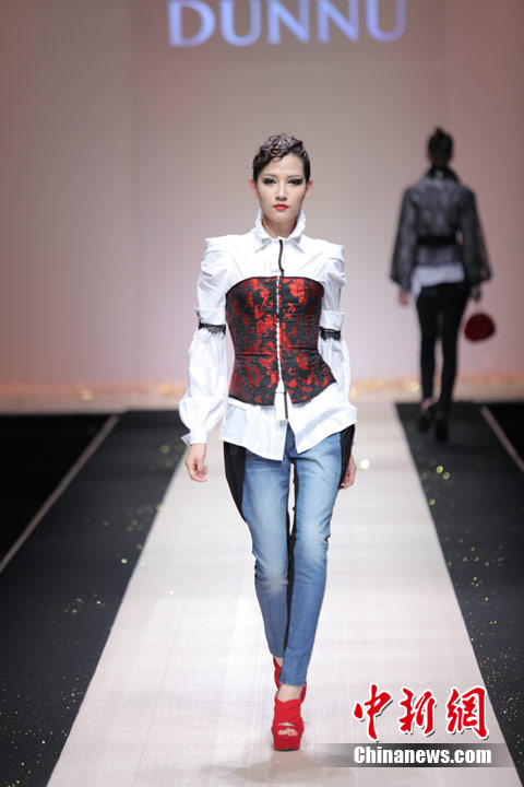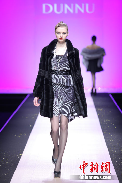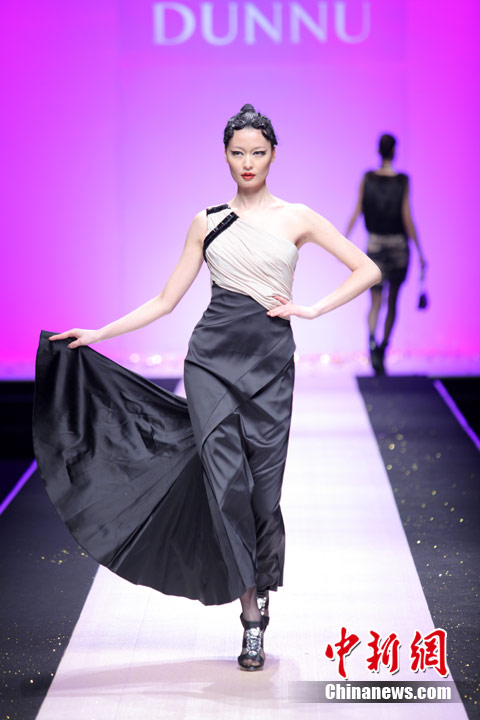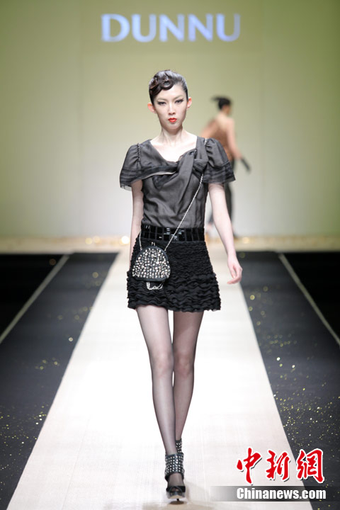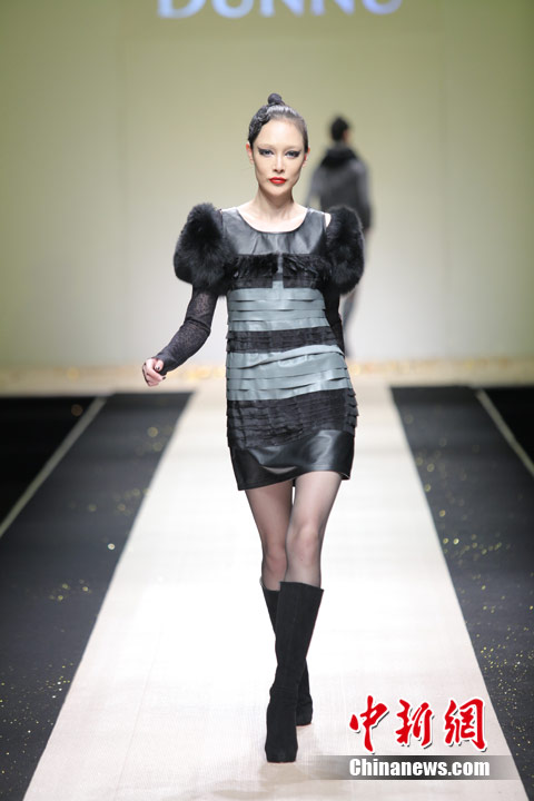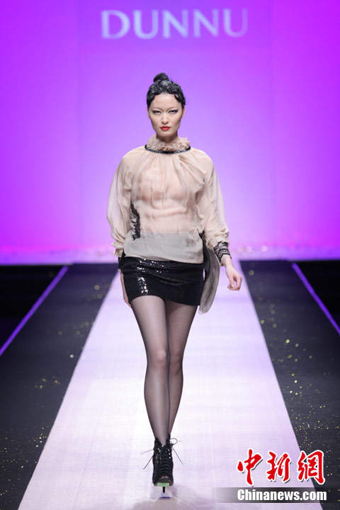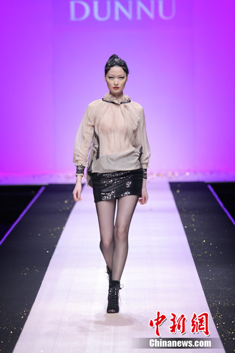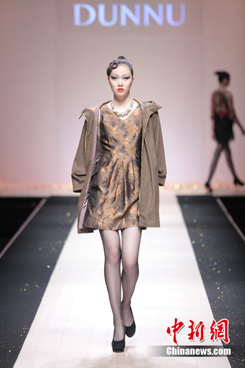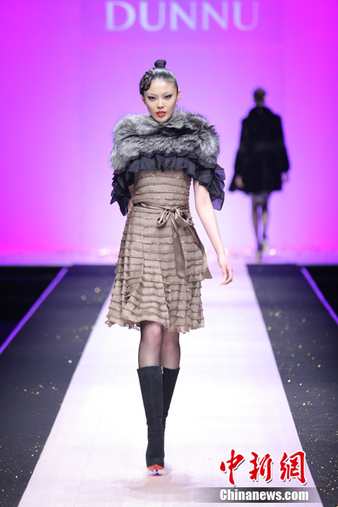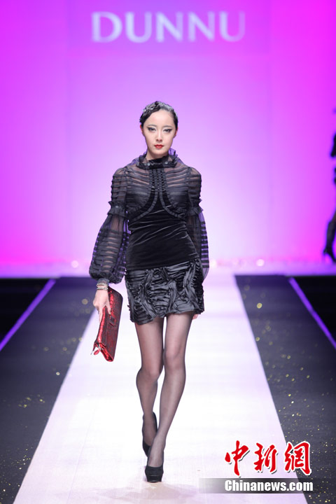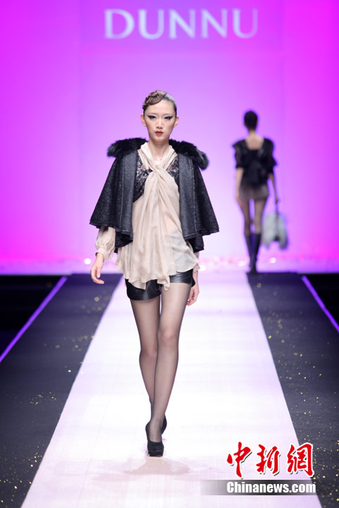 3月29日,中国国际时装周,敦奴DUNNU 2011/2012秋冬时装发布会—“蜕”在京举行。此系列灵感来自于大自然美丽、动人的蜕变,飞舞的蝴蝶是大自然赐予人类的梦幻羽翼,在五彩的光环下,款款多姿的时装渲染了蜕变后一种心动的华丽转身。北京新面孔模特教育传媒机构供图