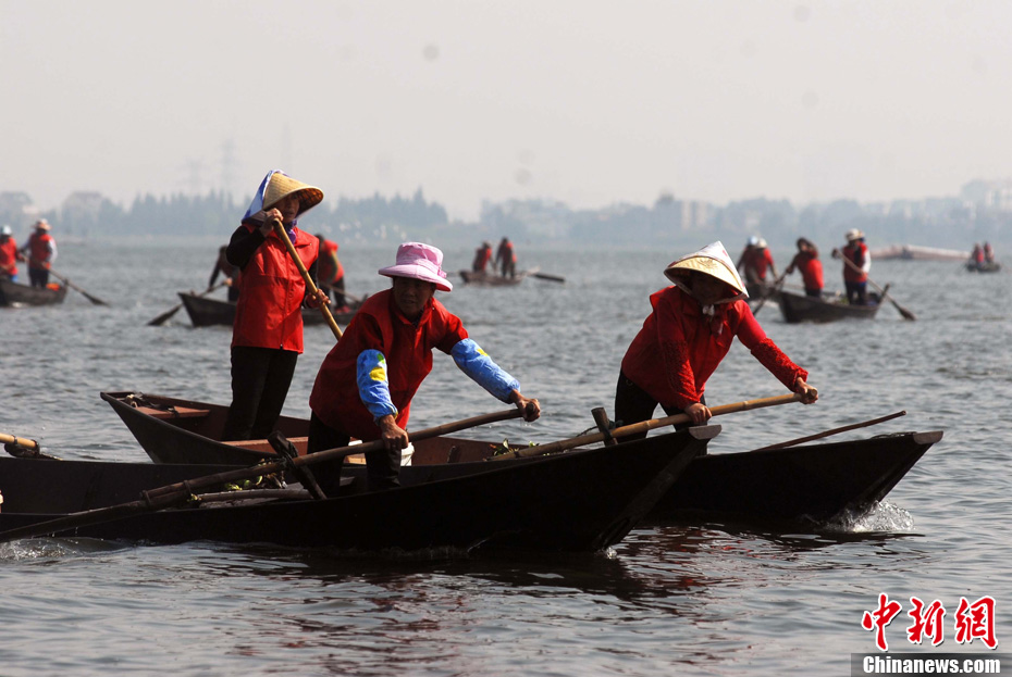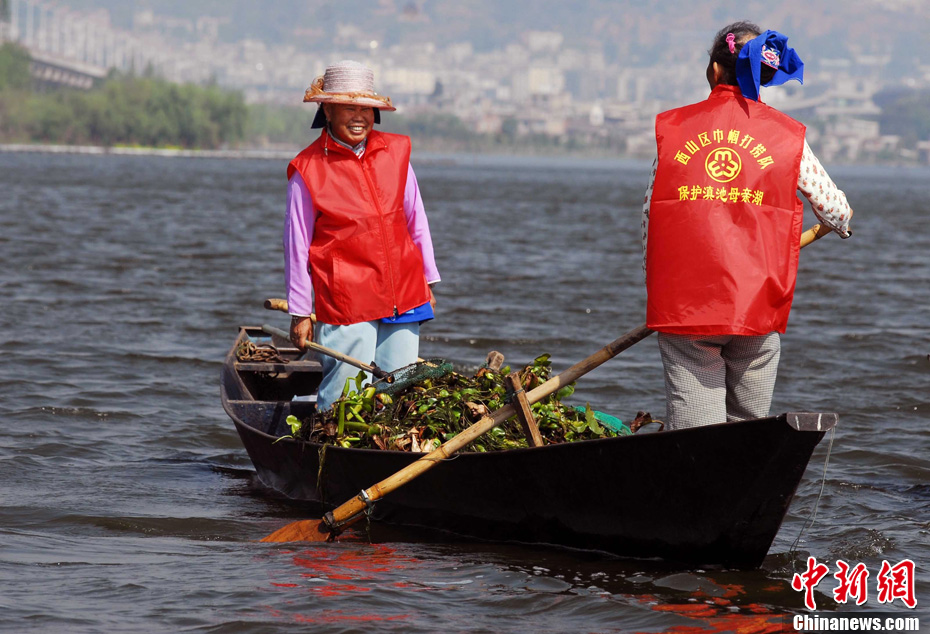图为巾帼打捞队员在滇池上打捞水葫芦。中新社发 任东 摄