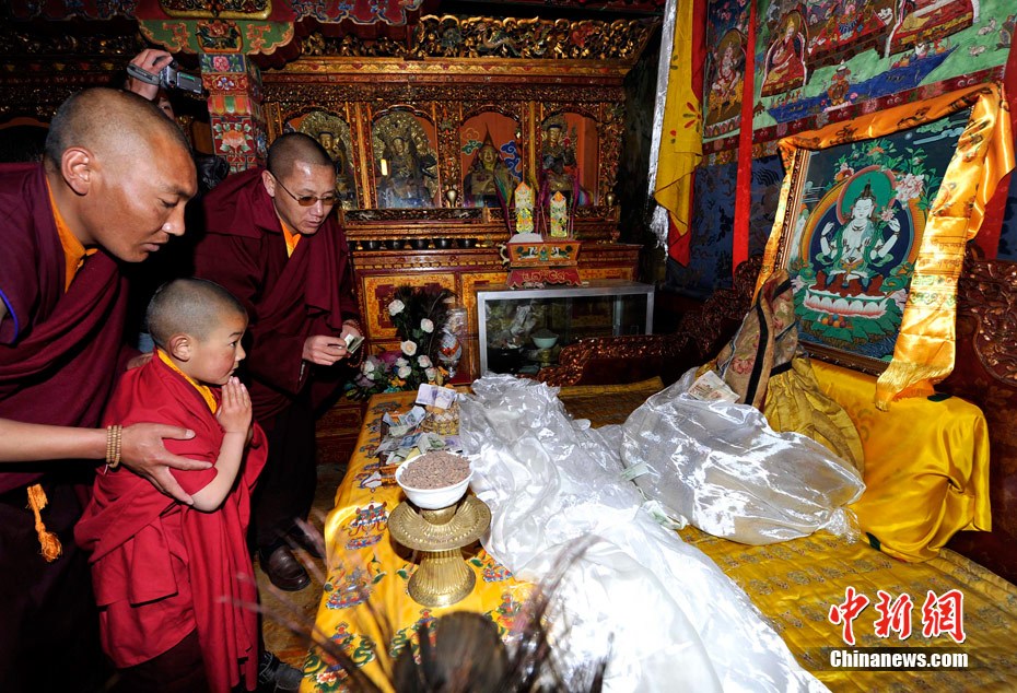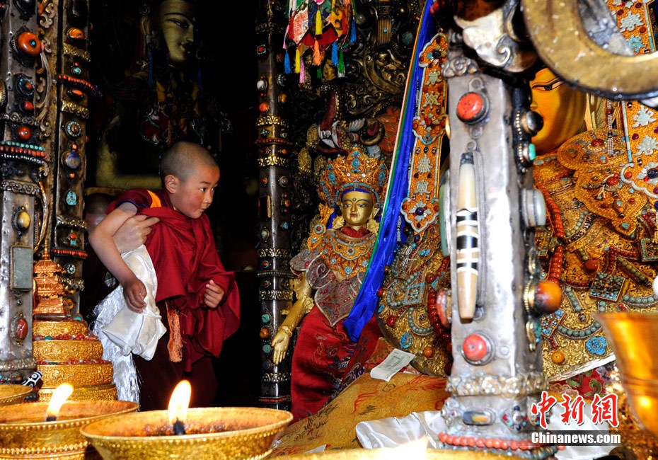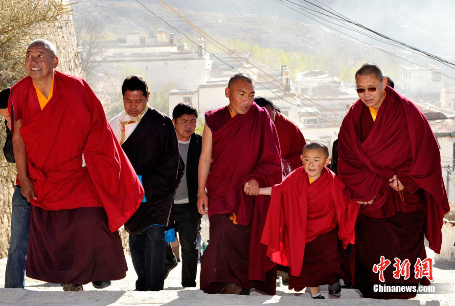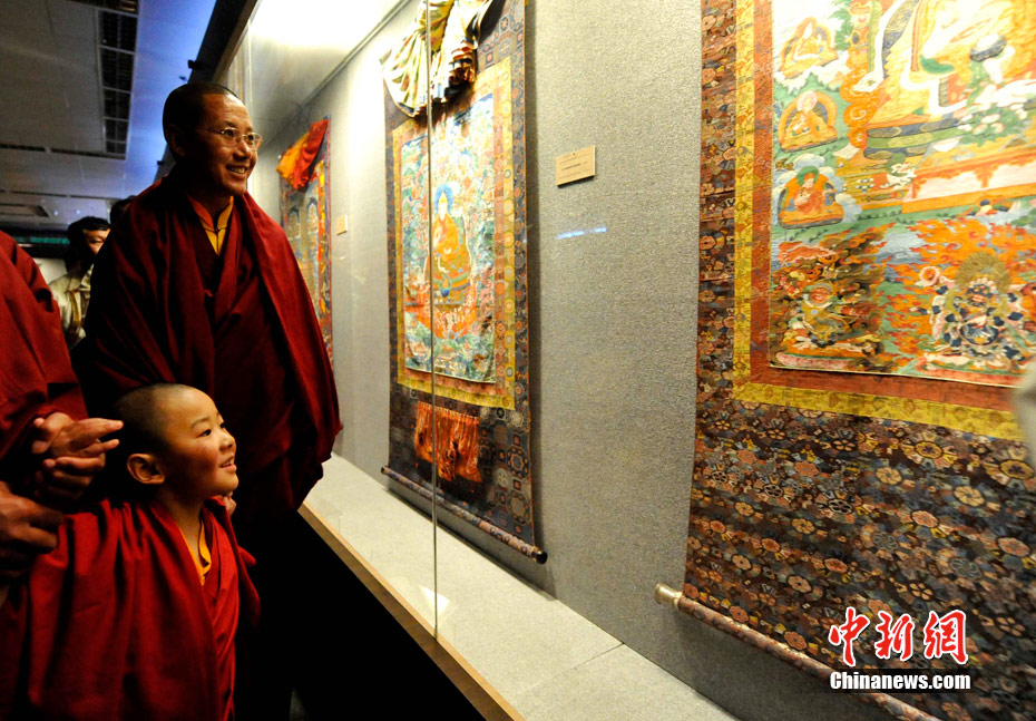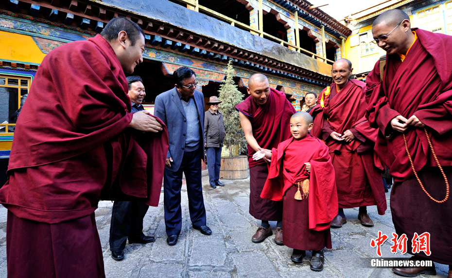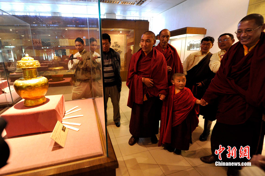 4月18日,第六世德珠•加羊西绕班典活佛(图左第三人)参观西藏博物馆,并不时向讲解员提问。李林 摄