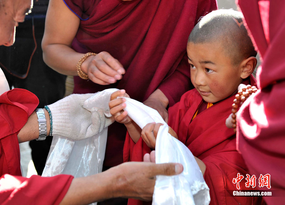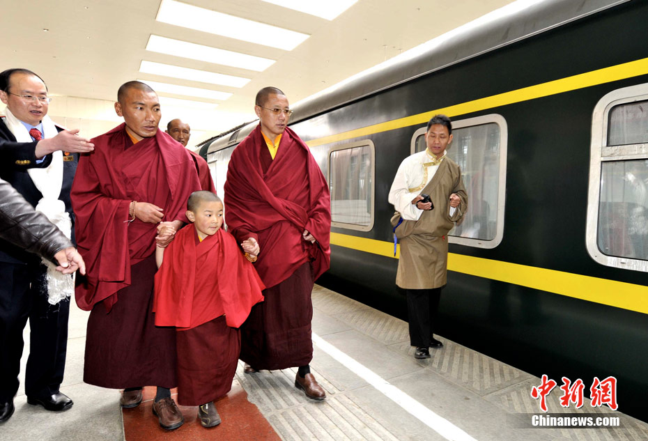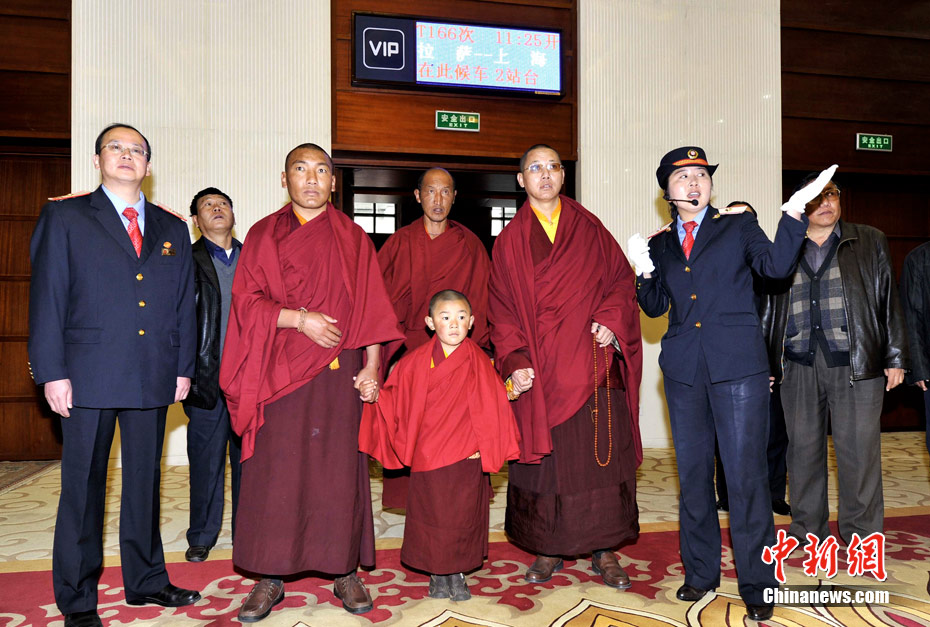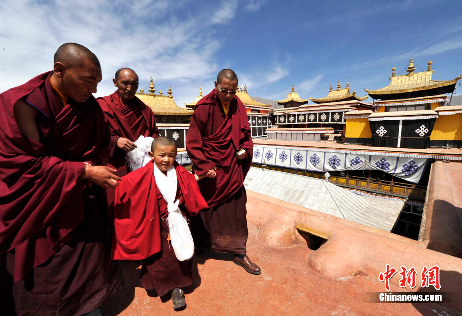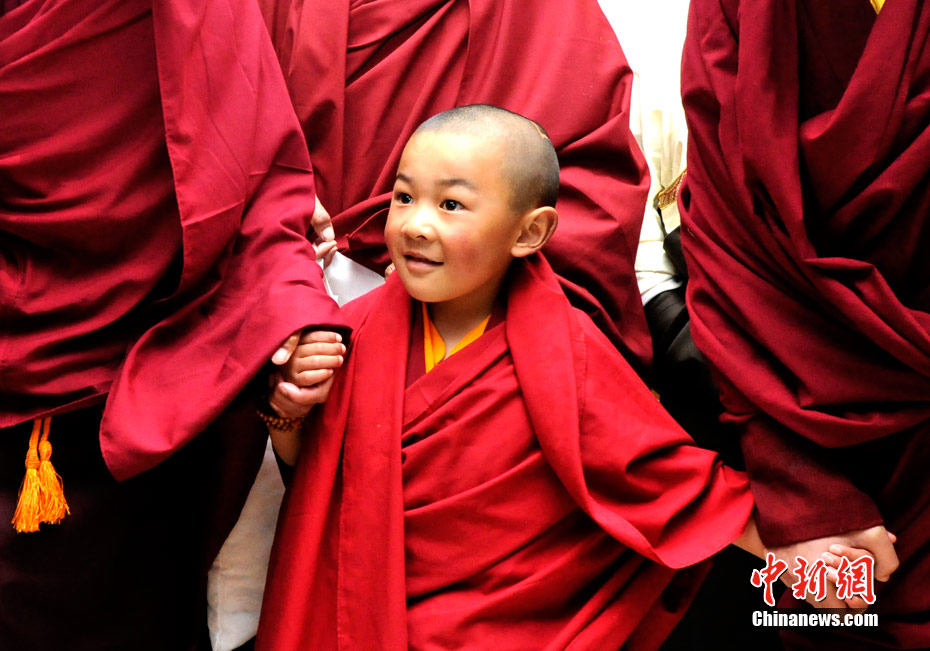 4月18日,第六世德珠•加羊西绕班典活佛(图左第三人)参观西藏博物馆,并不时向讲解员提问。李林 摄